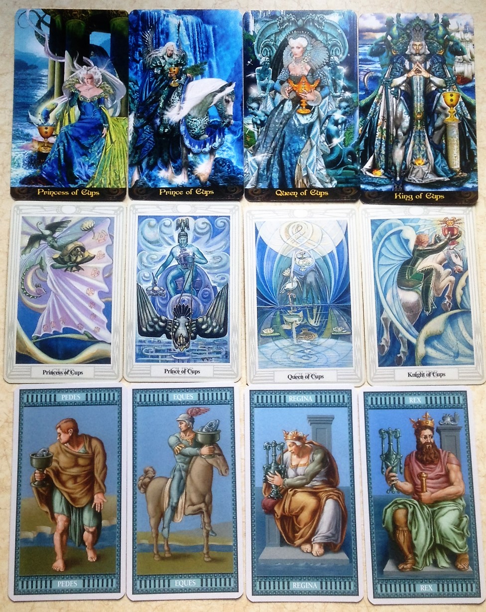 The Court cards for the cups in the Tarot Illuminati (top), Thoth Tarot (middle), and the Michelangelo Tarot (bottom)